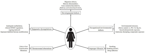 Incorrect lifestyle, i.e., smoking, alcohol intake, and illicit drug consumption, also causes serious detrimental effects on reproductive lives of both males and females. The harmful effects of smoking on female reproductive system specifically impaired ovarian function were evidenced by decreased estradiol and progesterone production by in vitro cultured human luteinized granulosa cells under direct environmental tobacco smoke exposure [60]. A concentration (environmental tobacco smoke exposure) dependent increase in the expression of CYP1B1 both at gene and protein levels was seen in the cultured granulosa cells. High activity polymorphism of CYP1B1 in cigarette smokers was also correlated with high risk of ovarian cancer development with disturbed hormonal regulation [61]. While analyzing retrieved ovarian cells from women undergoing assisted reproductive technologies (ART), major ovotoxic action of smoking was found to be oxidative stress and DNA damage in granulosa and oocyte cumulus cells, causing impaired functionality including improper oocyte maturation, gonadotropins binding to their receptors, increased zona pellucida thickness and reduced fertilization capacity [62,63,64,65]. In a cigarette smoke induced chronic obstructive pulmonary disease mouse model study, direct nasal exposure resulted into ovotoxicity by means of higher levels of primordial follicle depletion, apoptosis in antral follicle oocytes, induced oxidative stress and reduced availability of follicles for ovulation [66]. Similar ill effects were observed in other murine model studies targeting cigarette smoke induced ovarian impairment [67,68,69,70]. The effect of alcohol consumption on the female reproductive system and fertility has shown many contradictory results. In a study involving 124 patients undergoing routine urine inspection regarding steroidal hormone measurement, women with alcoholic habits during menstruation were shown to have >50% reduced conception probability during menstrual cycles [71]. Caffeine consumption further enhanced alcohol induced negative effects whereas no adverse effect was seen in participants consuming caffeine only. It has been reported that high consumption rate (rather than moderate alcohol consumption) results into decreased fertility [72]. However, a number of cohort case studies have exhibited no correlation between alcohol consumption and female infertility [73,74,75]. Illicit drug use has also been associated with the female reproductive system related issues. Previously, it was demonstrated that women with regular marijuana intake have increased risk for ovulatory dysfunction [76]. Another study concerning women with occasional or frequent marijuana intake habits, showed longer follicular phase, delayed ovulation, and slightly increased rate of ovulatory inhibition in comparison to non-marijuana users [77]. Contrastingly, in a recent report it was found that women with habits of co-use of marijuana with tobacco were shown to have shorter luteal phase than only tobacco users [78] however no differences between follicular phase and menstrual cycle lengths were observed among both types of participants. Missing correlating link between these studies corresponds to a number of factors including heterogeneity in the study design, volume or amount of cigarette/alcohol/illicit drug consumption on occasional or regular basis, exact time or duration of consumption (such as early age, during pregnancy or later stages), past intake history with no current consumption etc. Therefore, it’s hard to conclude whether such incorrect habits or life styles plays a direct or definite role in deteriorating reproductive life to a greater extent or not. However, as all of these lifestyles poses negative effects on the health therefore must be avoided much longer before conceiving or attaining pregnancy. Factors causing defects in germ cell development and fertility impairment has been depicted in Figure 3.