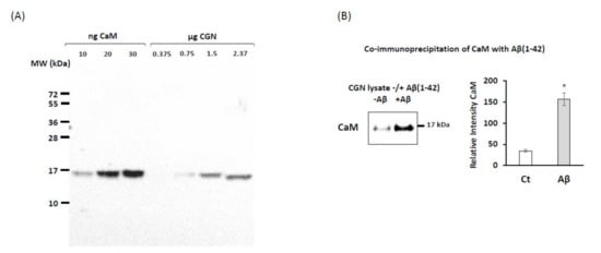 2.1. Co-Immunoprecipitation of Calmodulin (CaM) with Submicromolar Concentrations of Aβ(1–42) in Cerebellar Granule Neurons (CGN) Lysates