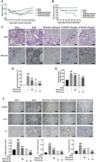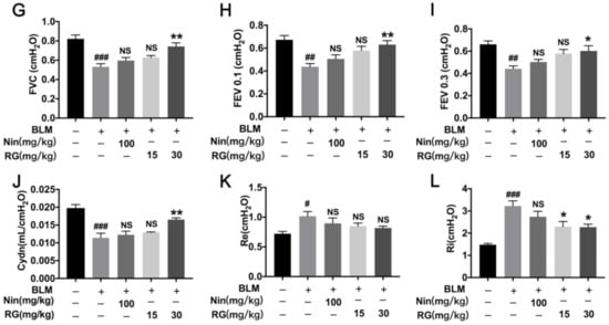 2.1. RG Attenuates BLM-Induced Pulmonary Fibrosis in Mice