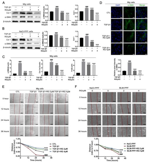 Fibroblast overactivation is the main method of cells to accelerate fibrotic procession in patients with IPF [23]. RG attenuated the TGF-β1-induced expression of α-SMA and Col 1 in Mlg and NaCL-PPF cells (Figure 2A,B and Figure S3A,B), and RG also inhibited the α-SMA expression level in BLM-PPF cells instead of NaCl-PPF cells (Figure S4). Quantitative real-time PCR results revealed that RG decreased the TGF-β1-induced mRNA levels of α-SMA, Col 1a1, and FN in Mlg cells (Figure 2C). Immunofluorescence was also performed for α-SMA in Mlg cells, and revealed that RG can inhibit the TGF-β1-induced protein levels of α-SMA (Figure 2D). In addition, a cell migration experiment showed that RG inhibited lung fibroblast migration in Mlg and BLM–PPF cells (Figure 2E,F). In summary, RG inhibits TGF-β1-induced myofibroblast activation, ECM accumulation, and lung fibroblast migration.