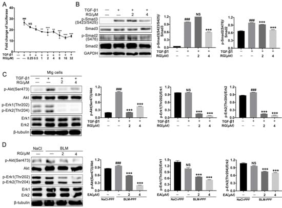 TGF-β1/Smad and TGF-β1/non-Smad signals play essential roles in pulmonary fibrotic progression in regulating fibroblast overaction. A TGF-β1/Smad3 luciferase reporter system was established to measure the inhibitory function of RG on this signal in CACA-NIH-3T3 cells. CAGA-NIH-3T3 cells treated with RG (0.0, 0.5, 1.0, 2.0, 4.0, 8.0, 16.0, and 32.0 μM) exhibited a dose-dependent decline of luciferase (Figure 3A). RG had a negative effect on the TGF-β1-induced phosphorylation of p-Smad3 (S423/425) and p-Smad2 (S476) in Mlg cells (Figure 3B). RG also inhibited the TGF-β1-induced phosphorylation of p-Akt (Ser473), p-Erk1 (Thr202), and p-Erk2 (Thr204) in Mlg cells, and BLM-PPF showed the same results (Figure 3C,D and Figure S3C,D). Therefore, RG suppressed TGF-β1/Smad and TGF-β1/non-Smad signaling, mainly by inducing the protein levels of p-Samd3, p-Smad2, p-Akt, and p-Erk1/2 in pulmonary fibroblasts.