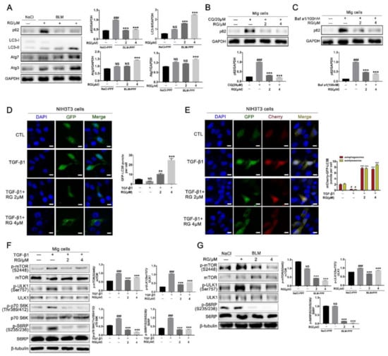 Autophagy formation plays a key role in fibrotic treatment, and whether RG positively affects autophagic flux and the underlying mechanism were investigated. NaCl-PPF and BLM-PPF cells were isolated from the lung of mice. The results revealed that RG increased the expression level of LC3-II, Atg3, and Atg7, and decreased those of p62 in PPF cells (Figure 4A). Bafilomycin A1 (Baf A1) and chloroquine (CQ), two kinds of autophagy inhibitors, increased p62 protein expression levels in pulmonary fibroblasts, but RG reversed this effect (Figure 4B,C). GFP-LC3B and mCherry-GFP-LC3B plasmids were transfected into NIH-3T3 cells to detect autophagy flux, and RG increased the number of autophagosomes and autolysosomes (Figure 4D,E). mTOR signaling is a core regulator of autophagic flux. Hence, the efficiency of RG as an inhibitor of mTOR signaling was evaluated. RG attenuated the TGF-β1-induced phosphorylation of p-mTOR (S2248), p-ULK-1 (S757), p-p70S 6K (Thr389/412), and p-S6RP (S235/236) (Figure 4F). RG was administered to BLM-PPF cells and decreased the phosphorylation levels of p-mTOR (S2248), p-ULK-1 (S757), and p-S6RP(S235/236) (Figure 4G). In conclusion, RG promotes autophagy mainly by suppressing the TGF-β1/mTOR signaling pathway.