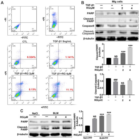 Promoting the apoptosis of myofibroblasts can alleviate pulmonary fibrosis in patients with IPF. Flow cytometry is a prominent method for analyzing the effect of apoptosis. The results show that RG increased the number of instances of late apoptosis of activated fibroblasts induced by TGF-β1, but its effect on the early apoptosis of cells was not significant (Figure 5A). Increasing the expression of apoptosis-related proteins in myofibroblasts was beneficial for fibrotic progression. Our cellular results indicated that RG increased the TGF-β1-induced expression levels of cleaved PARP and cleaved-caspase 9 in Mlg cells, as well as cleaved PARP in BLM-PPF cells (Figure 5B,C). In summary, RG attenuated pulmonary fibrosis mainly by promoting the apoptosis of myofibroblasts.