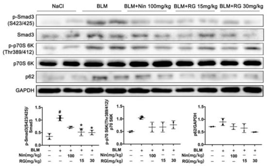 RG was used to verify the mechanism that alleviates pulmonary fibrosis in the in vitro cellular model and animal model. Hence, the following experiments mainly concentrated on the evaluation of RG’s in vivo effects. C57BL/6J mice were treated with RG (15 or 30 mg/kg) from days 7–14 after BLM was induced, and the lung tissues were isolated from mice as soon as possible, and extracted to analyze the effect of RG on autophagy formation and TGF-β1 signaling in vivo. Western blot analysis showed that RG suppressed the expression levels of p-Smad3 (Ser423/Ser412), p-p70S 6K (Thr389/412), and p62 in left lung tissues (Figure 6). These experimental results implied that RG promotes myofibroblast autophagy and inhibits myofibroblast activation and ECM production mainly via the TGF-β1 signaling.
