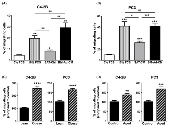 The chemotaxis of PCa cells towards BM-Ad-CM is enhanced by obesity and ageing. In vitro migration of C4-2B (A) or PC3 (B) towards a medium containing either 0% (used as a negative control), 10% FCS or towards SAT-CM or BM-Ad-CM (n = 4–5/group). Statistical analysis by One-way ANOVA with Holm-Sidak’s multiple comparisons test was performed. (C) In vitro migration of the indicated PCa cell lines towards BM-Ad-CM from lean (age: 62.8 ± 6.9 years, BMI: 21.4 ± 3.3 kg/m2) or obese (age: 63.3 ± 10.1 years, BMI: 33.3 ± 2.3 kg/m2) subjects (n = 5/group). (D) Similar experiments were performed with aged (age: 75.7 ± 5.7 years, BMI: 23.3 ± 4.3 kg/m2) and younger control (age: 60.2 ± 5.2 years, BMI: 22.1 ± 3.5 kg/m2) subjects (n = 5/group). Data are shown as mean ± sem (A,B) or mean of migrating cells (with the control groups set at 100%) ± sem (C,D). Statistical analysis by Student’s t-test was performed. * p < 0.05, ** p < 0.01, *** p < 0.001, **** p < 0.0001, ns: not significant.
