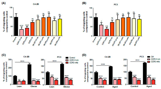 CCR3 is an important driver in the directed migration of PCa cells towards BM-Ad-CM and its effect is majored in obesity and ageing conditions. In vitro migration of C4-2B (A) or PC3 (B) Table 1. CCR3 (UCB35625, 200 nM), CCR2 (sc-202525, 25 nM), CXCR1/2 (SB225002 inhibitor, 50 nM) or CXCR4 (AMD3100, 100 nM) or with mAbs against CCR3, CXCR1, CXCR2 or CXCR4 (all used at 10 μg/ml). Bar plots represent the percentage of migrating cells relative to the migration of untreated cells (set to 100%). Data are shown as mean ± sem (n = 4–6). The statistical significance between means of migrating cells (in %) in treated vs. control cells was evaluated by One-way ANOVA with Tukey’s multiple comparisons test. Similar experiments were performed with the indicated cell lines towards BM-Ad-CM obtained either from lean/obese (C) or control/aged (D) subjects in the presence of CCR3 inhibitors and blocking mAb. Data are shown as mean ± sem (n = 4–9). The statistical significance between mean of migrating cells (with the control groups set at 100%) was evaluated by Two-way ANOVA with Sidak’s multiple comparisons test. * p < 0.05, ** p < 0.01, *** p < 0.001, **** p < 0.0001, ns: not significant.