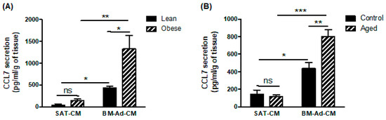 CCL7 is highly secreted by BM-Ads and its secretion is enhanced in obesity and ageing conditions. Secretion of CCL7 was evaluated by ELISA in SAT-CM or BM-Ad-CM either obtained from lean/obese (A) or control/aged (B) subjects. Data are shown as mean ± sem (n = 3–5). The statistical significance was evaluated by Two-way ANOVA with Tukey’s multiple comparisons test. * p < 0.05, ** p < 0.01, *** p < 0.001, ns: not significant.