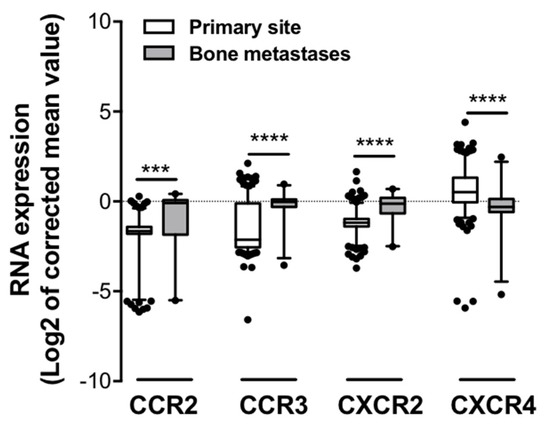 Expression of chemokine receptors in primary versus bone metastases of human PCa. The cancer microarray database, Oncomine was used to compare the RNA expression of several chemokine receptors (CCR2, CCR3, CXCR2 and CXCR4) in patient samples collected from bone metastatic (grey squares) or primary sites (white squares) from six different data-sets. Differences between the two independent groups were evaluated with Mann-Whitney’s test. *** p ≤ 0.001, **** p ≤ 0.0001.