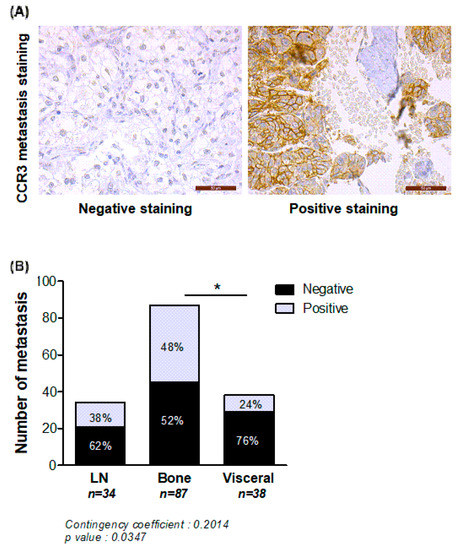 CCR3 is overexpressed in bone compared to visceral metastasis in human PCa. Metastatic PCa samples coming from different sites (lymph nodes (LN), visceral or bone) were stained for CCR3, and categorized as positive or negative for CCR3 expression. (A) Representative examples of negative and positive staining in bone metastases are shown. Scale bars, 50 μm. (B) Quantification of the number of metastasis negative or positive for CCR3 according to their anatomical location (LN (n = 34), visceral (n = 38) or bone (n = 87). Percentage of each group is mentioned in each bar graph. Chi2 statistic test was performed (p = 0.0347) and contingency coefficient was calculated (0.2014). Comparison between location was evaluated by fisher’s exact post-test (* p < 0.05).