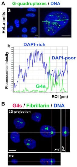 We studied the localization of G-quadruplex structures in human cervical carcinoma cells HeLa. We observed that G4s are located outside DAPI-dense regions showing clusters of centromeric heterochromatin, called chromocenters. DAPI (4′,6-diamidino-2-phenylindole) binds to AT-rich sequences; thus, we can conclude that G4s are located in GC-rich genomic regions (Figure 2Aa,b). We also analyzed a link of G4s to the compartment of nucleoli, and we found an absence of G4s inside the fibrillarin-positive region of nucleoli (Figure 2B).