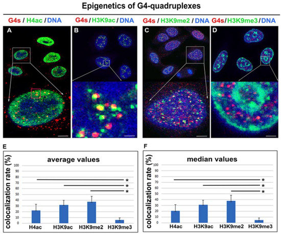 Histone signature of G4 structures in HeLa cells. (A) G4s (red) structures were associated with acetylated histones H4 (green). (B) G4s (red) and H3K9ac (green). (C) G4s (red) and H3K9me2 (green). (D) G4s (red) and H3K9me3 (green). DAPI (blue) was used as a counterstaining of the cell nucleus. Scale bars represent 3 µm in panels A, C and 1 μm in panels B, D. Arrows show enlarged selected cells or selected regions inside cell nuclei. Panels show the rate of colocalization between G4s and H4ac, G4s and H3K9ac, G4s and H3K9me2, G4s and H3K9me3. Panel (E) illustrates data documenting colocalization rate and its average values. Panel (F) shows the colocalization rate in terms of median values. Data are presented as a colocalization rate with standard errors (S.E.). The normality test (Shapiro–Wilk) passed for comparison of G4s/H4ac and G4s/H3K9me3. In this case, the difference in the mean values of the two groups was greater than would be expected by chance; there is a statistically significant difference between the input groups (p ≤ 0.001). The Student’s t-test revealed statistically significant differences, as indicated by asterisks (*). As reference values, the colocalization rates of G4s/H3K9me3 were used. The normality test (Shapiro–Wilk) failed for H3K9ac (H3K9me2) and H3K9me3, but the Mann–Whitney rank sum test showed that the difference in the median values between the two groups was greater than would be expected by chance; there was a statistically significant difference (p ≤ 0.001).