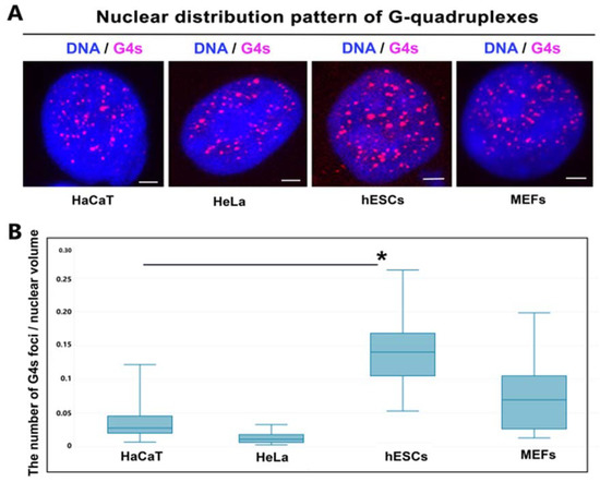 Nuclear distribution of G4s in distinct cell types. (A) Confocal microscopy of G4s in the following cell types: HaCaT, HeLa, hESCs, and MEFs. (B) Analysis of the number of G4s per nuclear volume of individual cells studied in panel (A). For analysis, we used 30–40 cell nuclei (experiments were repeated three times). Leica LAS X software was used for data analysis. Lines inside box plots show medians; 50% of the data is inside the box plots, and line segments show border values. Data are shown as the average number of G4s foci ± standard errors (S.E.). Bars show the lowest and highest value. When using the Student’s t-test, the normality test (Shapiro–Wilk) failed (p < 0.050), but the Mann–Whitney rank sum test revealed that the difference in the median values between the two groups (HaCaT and hESCs) is greater than would be expected by chance; there was a statistically significant difference (p ≤ 0.001). A statistically significant difference is indicated by an asterisk (*). As a reference value, the number of G4s in HaCaT cells was used.