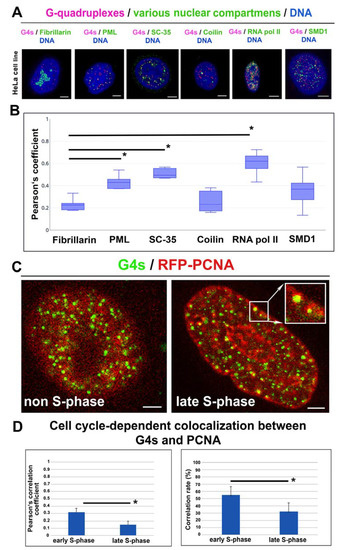 The spatial relationship between G4s and nucleoli, PML bodies, SC35-positive nuclear speckles, Cajal bodies, RNAP II-positive transcription factories, and PCNA-positive replication foci. (A) The nuclear distribution pattern of G4s (red) and fibrillarin (green), PML nuclear bodies (green), the SC35 protein (green), the coilin protein (green), phosphorylated form of RNAP II (green), and the SMD1 protein is shown. (B) Analysis of a degree of colocalization between G4s and nuclear compartments. In the cases indicated by an asterisk (*), the equal variance test (Brown–Forsythe) passed, similarly, the normality test (Shapiro–Wilk), so that the Student’s t-test showed the difference in the mean values of the two groups as greater than would be expected by chance; there is a statistically significant difference between the input groups (p ≤ 0.001). As a reference, the Pearson’s correlation coefficient was used for those observed for G4s and fibrillarin. Bars show the lowest and highest level of the Pearson’s correlation coefficient. Data in panel B represent the median of the Pearson’s correlation coefficient with minimal and maximal values. (C) The reciprocal link between G4s and PCNA-positive foci in non-S phase cells and the late S-phase of the cell cycle. Data originate from 30–40 nuclei analyzed for each experimental event. In panel (D), the Mann–Whitney U test was used for the statistical analysis, showing differences between G4s colocalization with PCNA-positive replication foci in the early S-phase and the late S-phase of the cell cycle. Asterisks indicate statistically significant differences at α = 0.05.