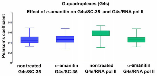 In detail, we also studied a link between G4s and so-called “transcription factories” and nuclear speckles, positive on the splicing factor, the SC-35 protein. We tested the phosphorylated form of RNAP II (RNAP II-phS5) that occupies specific regions in the cell nucleus (transcription factories). It is believed that GC-rich sequences are transcribed in these nuclear compartments. Thus, we tested if an inhibitor of RNAP II, α-amanitin, can affect the degree of colocalization between G4 structures and RNAP II foci. Similarly, we studied the effect of α-amanitin on G4s colocalization with SC-35 positive foci. In these cases, α-amanitin did not change the colocalization rate between G4s and given nuclear compartments that we learned (Figure 6).