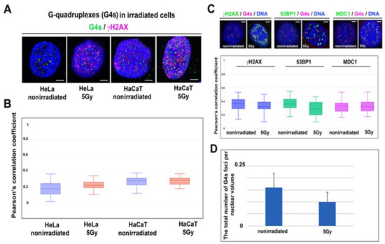 Irradiation by γ-rays does not change the γH2AX-, 53BP1-, MDC1-positivity in G4 structures, as shown in panels (A–C), in HeLa and HaCaT cells. Data in panels (A,B) originate from experiments performed by the use of BG4 antibody, and for data in panels (C,D), we used 1H6 antibody. Panel (D) shows the number of G4s/nuclear volume calculated in nonirradiated and γ-irradiated cells. Scale bars show 5 µm. The Mann–Whitney U test was used for the statistical analysis, but no significant differences were observed in G4s and DNA repair proteins studied in nonirradiated and γ-irradiated cells. The difference in the median values between the two groups (nonirradiated and irradiated cells) is not great enough to exclude the possibility that the difference is due to random sampling variability; there were no statistically significant differences (p = 1.000).