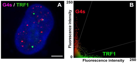 Example of the degree of colocalization between shelterin protein TRF1 (green), associated with telomeres, and G4 (red) structures in HeLa cells. Data were analyzed by Leica LAS X software and originate from one selected confocal section; thus, only several telomeres (green) are visible. (A) Confocal images show the distribution profile of GFP-tagged TRF1 (green) and G4s structures (red). Scale bar shows 5 μm. (B) The scatter plot (Leica LAS X software) shows a low degree of colocalization between the TRF1 protein and G4s.