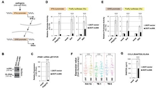 We examined a role of nc886 in the IFN-β signaling, given its importance in infection, inflammation, and associated disorders [13]. Pathogen intrusion triggers the expression of IFN-β that acts in an autocrine or paracrine manner, leading to activation of a set of promoters containing an ISRE(s) (shortly termed “ISRE promoter”) and ultimately to expression of ISGs (Figure 1A and Introduction).