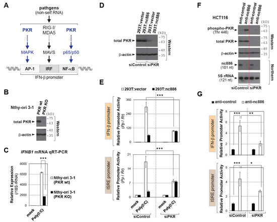 The IFN-β promoter contains three regulatory elements; AP-1, IRF, and NF-κB (Figure 2A and [3]). PKR is an upstream activator of AP-1 and NF-κB [8] and so is implicated in the IFN-β signaling. Previous reports showed that the induction of IFN-β expression by synthetic non-self RNA or a virus is attenuated upon PKR KD by short hairpin RNA or short interfering RNA (siRNA) [9,10]. We corroborated these KD data in a PKR knockout (KO) cell line that we had generated from an immortalized thyroid cell line, Nthy-ori 3-1 (Figure 2B). The induction of IFN-β expression by Poly(I:C) was less in PKR KO cells than in the parental wild type (wt) cells (Figure 2C). Our data ensured the requirement of PKR in the IFN-β signaling.