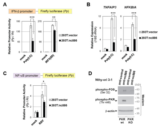 Having confirmed that nc886 suppressed NF-κB and/or AP-1, we further scrutinized individual elements. To assess the NF-κB activity, we measured expression levels of two representative NF-κB target genes, NFKBIA and TNFAIP3. Their expression was induced by Poly(I:C), and this induction was less in nc886-expressing cells (Figure 3B). nc886′s effect on NF-κB activity was also evaluated by a luciferase assay measuring the activity of a promoter containing NF-κB responsive elements. This promoter was induced by viral infection, and this induction was attenuated in nc886-expressing cells (Figure 3C). These data proved nc886′s suppressive effect on the NF-κB pathway.