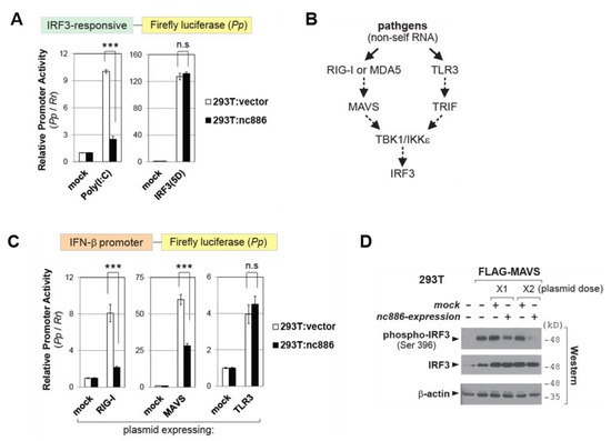 nc886 suppresses the IRF3 pathway. (A) Luciferase assays as described in Figure 3A, except that Poly(I:C)-LMW was used. (B) Simplified image for RIG-I and TLR3 pathways. Solid arrows designate pathogen sensing by indicated proteins; dotted arrows designate signal transduction between indicated proteins, which often involves multiple other factors. (C) Luciferase assays as described in panel A. (D) Western blot of indicated proteins at 24 h after transfection of MAVS-expressing plasmid in combination with control (“mock”) or nc886-expressing plasmid. Three asterisks designate a p-value less than 0.001. “n.s.”: not significant.