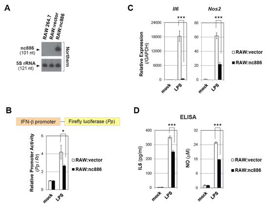 Macrophages play a paramount role in the inflammatory process. Upon sensing bacterial infection, they release cytotoxic molecules and cytokines, such as nitric oxide (NO) and interleukin 6 (IL6) (reviewed in [4,20]). We investigated a role of nc886 in IFN-β and inflammation of macrophages. RAW 264.7 is a mouse macrophage cell line and does not express nc886. We constructed a RAW 264.7 derivative cell lines which stably expressed nc886 or a control cell line which did not express nc886 (designated “RAW:nc886” and “RAW:vector” in Figure 5A). These cells were treated with LPS, a molecular pattern of gram-negative bacteria. LPS treatment activated the IFN-β promoter also in macrophages and this activation was weaker when nc886 was expressed, as shown by luciferase assays (Figure 5B). Next, we measured the expression of Il6 and Nos2. Nos2 encodes an enzyme “Nitric oxide synthase, inducible”, which is responsible for NO production by macrophages upon pathogen intrusion [20]. LPS treatment induced Il6 and Nos2 expression, and this induction was remarkably diminished in RAW:nc886 cells as compared to RAW:vector cells (Figure 5C). Consequently, nc886 inhibited IL6 secretion and NO production which were induced by LPS (Figure 5D). All these data indicated that nc886 suppressed the IFN-β signaling also in macrophages and attenuated their response to pathogens.