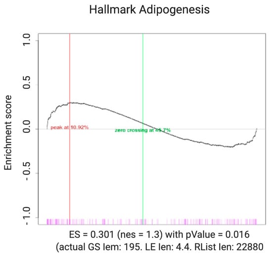 GSEA Enrichment plot (KEGG pathways) for Adipogenesis. Adipogenic signaling pathways are positively enriched in the arrhythmogenic right ventricular cardiomyopathy (ARVC) dataset for which genes belonging to the canonical adipogenic pathways (HALLMAK_ADIPOGENIC gene set) were analyzed. The black curve corresponds to the enrichment score (ES), which is the running sum of the weighted enrichment score obtained from GSEA software with the normalized enrichment score (NES) and specified p-value.