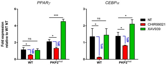 qRT–PCR analysis of PPARγ and CEBPα in PKP2mut and control cardiac myocytes (CMs) cultured in presence of canonical Wnt inhibitor (XAV939) and activator (CHIR99021).WT and PKP2mut CMs treated with CHIR99021 (red bars) show a downregulation of the adipogenic master regulator genes, PPARγ (left panel) and CEBPα (right panel), compared to their untreated counterpart. In agreement with the mathematical model, a higher difference of expression between untreated and treated cells was detected for the WT group and the relative percentage of expression is written in blue. XAV939 treatment (green bars) induces an upregulation of adipogenic genes in PKP2mut cells only. n = 3; ns = Not significant. * p < 0.05,*** p < 0.001; t-test. Data are shown as means SEM; NT = not treated.