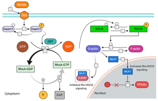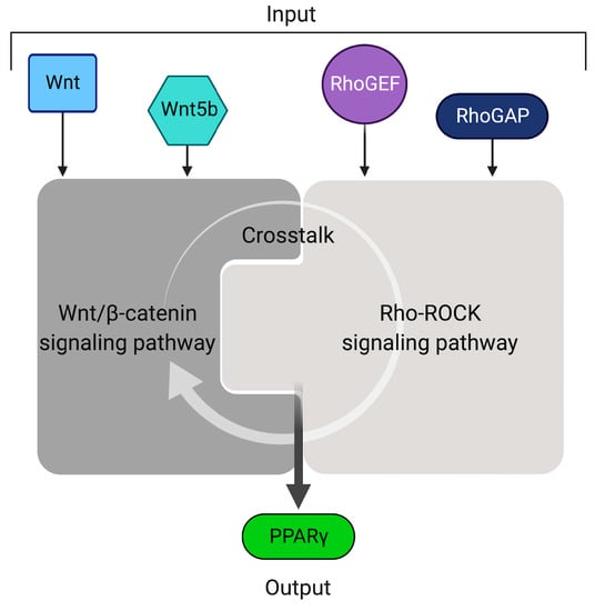 Schematic representation of integrative model for Wnt/β-catenin and RhoA-ROCK pathways. Inputs are represented by species able to activate/inactivate the two pathways (Wnt and Wnt5b for canonical and noncanonical Wnt signaling, and RhoGEF and RhoGAP for the RhoA-Rho-associated protein kinase (ROCK) signaling, respectively). Different combinations of inputs will have different effects on PPARγ expression.