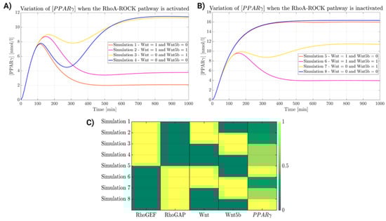 PPARγ variations in response to activation/inactivation of Wnt/β-catenin and RhoA-ROCK pathways. Orange, purple, yellow and blue curves are obtained by varying the concentrations of Wnt and Wnt5b. Panels (A,B) show activation (high concentration of Rho-GEF, 100 nM, and low concentration of Rho-GAP = 0) and inactivation (high concentration of Rho-GAP, 100 nM, and low concentration of Rho-GEF = 0) of RhoA-ROCK pathway, respectively. (C) ColorMap summarizes the effects of the eight simulated experimental conditions on the steady-state concentration of PPAR. Each column is normalized with respect to its maximum value.