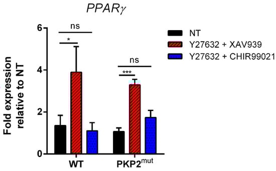 qRT–PCR analysis of PPARγ expression in WT and PKP2mut CMs after 12 days of Wnt/β-catenin and RhoA-ROCK pathways modulation. Treatment with 30 µM Y27632 (Rock inhibitor) in combination with 10 µM XAV939 (Wnt inhibitor) leads to a significant overexpression of PPARγ respect to untreated CMs (red striped bars); treatment with 3 µM CHIR99021 (Wnt activator) in combination with Y27632 restored the expression of PPARγ to levels almost equal to untreated cells in WT group, while PKP2mut CMs do not undergo to a complete PPARγ downregulation (blue dotted bars); n = 3; * p < 0.05, *** p < 0.001; t-test. Data are shown as means SEM; NT = not treated.