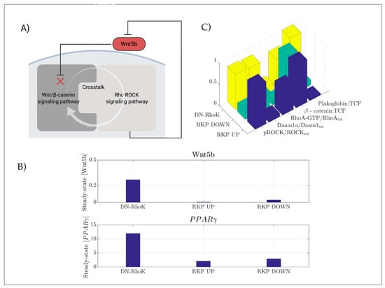 (A) Loop of negative feedback described in our model. (B) Trends of steady-state concentrations of Wnt5b (upper panel) and PPARγ (bottom panel) in the three conditions analyzed (DN-RhoK, RKP UP and RKP DOWN). (C) Concentration of pROK (Rho active kinase), active Daam1 and RhoA-GTP, with respect to the total, normalized concentrations of the β-catenin-TCF and PG-TCF complexes in the three biological situations analyzed.