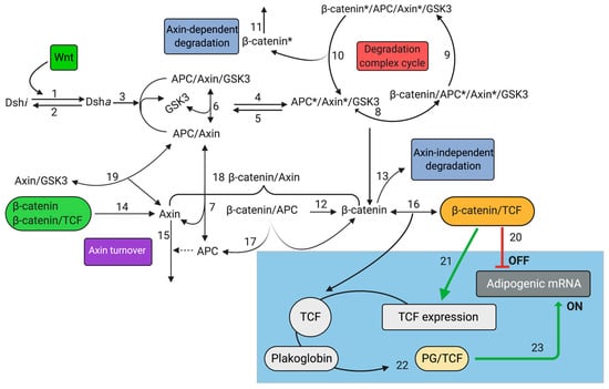 The Rho pathway is known to be involved in adipogenesis through two distinct mechanisms: one direct, driven by the transcription factor MLK1 (Megakaryoblast Leukemia 1), and one indirect through a crosstalk with the Wnt pathway. RhoA activation does not directly affect β-catenin stabilization/accumulation, but rather acts as a “positive modifier” working synergistically with the Wnt []. Additionally, active RhoA enhances the activity of β-catenin by promoting its transcription activity [,]. We traced a set of in silico reactions, shown in Figure 11.