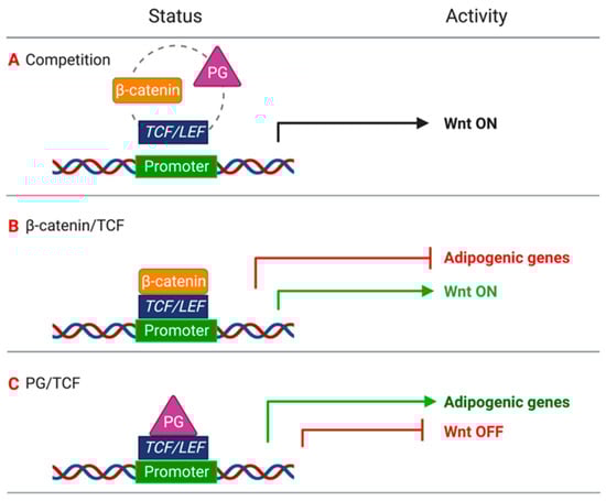 Competition of β-catenin and PG for TCF/LEF binding and relative activity. (A) β-catenin and PG compete for the binding to TCF/LEF; (B) when β-catenin/TCF binds to the promoter the transcription of adipogenic genes is inhibited; and (C) PG/TCF complex binds to the promoter of adipogenic genes and mediates their transcription.