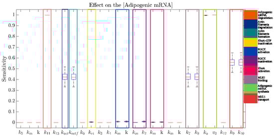 where represents a modifier, here represented by ROCK, which is responsible for the formation of actin filaments from gActin; ; a mass action with constant kinetic equal to was used to determine the polymerization of F-actin. The results of the MPSA on the Adipogenic mRNA for RhoA-ROCK pathway are shown in Figure 12.