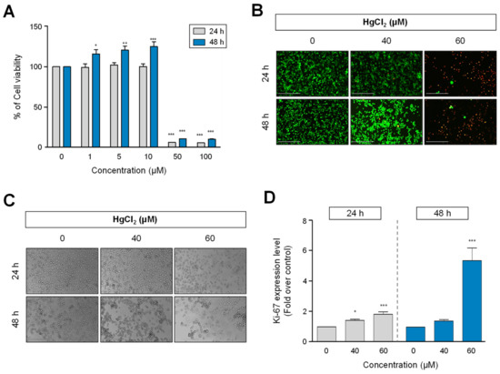 To investigate the cellular physiological effects of HgCl2 treatment, H1299 cells were treated with different concentrations of HgCl2 for 24 and 48 h. First, we tested the cell viability using a MTS (Tetrazolium inner salt) assay. As shown in Figure 1A, exposure to HgCl2 significantly decreased the viability of H1299 at high concentrations (50–100 μM). Compared to the control group, HgCl2 reduced the cell viability, with an IC50 value of 36.2 μM at 48 h incubation. The cell viability test was further measured using the live or dead assay with H1299 cells. For this, we treated various concentrations of HgCl2 (0–20 μM) in H1299 cells. However, no results did not reveal in this dose range (Supplementary Figure S1A,B). Based on these results, we selected an effective concentration range of HgCl2 treatment (40, 60 μM) for the live or dead assay and the subsequent experiments. Concordance with Figure 1A, HgCl2 treatment strongly increased the number of dead cells at 60 μM for both time points, but no effect was detected with 40 μM exposure (Figure 1B). We also observed the morphological changes by HgCl2 treatment using phase-contrast microscopy. HgCl2 treatment showed morphological features corresponding to apoptotic cell death such as cellular shrinkage, forming apoptotic bodies in a dose- and time-dependent manner (Figure 1C), suggesting HgCl2 has cytotoxic effects in human non-small-cell lung cancer cell line, H1299. To further investigate whether HgCl2 affected cell proliferation, cells were immunostained with specific antibodies against Ki-67, which is a cell proliferation marker, and analyzed using flow cytometry. HgCl2 treatment significantly elevated cell proliferation in a dose- and time-dependent manner, contrary to our expectation. Especially, the proportion of Ki-67 positive cells were raised at 60 μM treatment of HgCl2 compared to the control (Figure 1D).