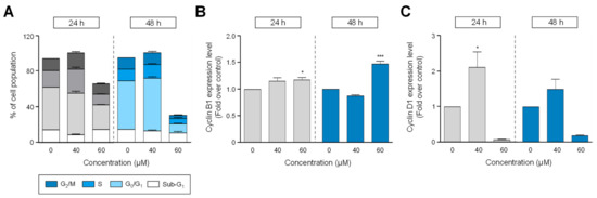 Alters in cell cycle progression of human non-small cell lung carcinoma cells following HgCl2 exposure. Cells were treated with 40, 60 μM of HgCl2 for 24 or 48 h. (A) After HgCl2 treatment, cells were fixed with 70% EtOH for 1 h. Cell cycle distribution was analyzed by FACS based on propidium iodide (PI) staining as described in materials and methods. Values are the percentage of each population in the Sub-G1, G0/G1, S, and G2/M-phase. To detect cell cycle-related markers, cells were fixed with 1% PFA for 6 hours. Then, cells were stained with the specific antibody against cyclin B1 (B) or cyclin D1 (C) for 30 min followed by flow analysis. Data are presented as the percentage of cyclin B1- (B) or cyclin D1 (C) positive cells and shown as mean ± SEM, n = 6. * p < 0.05, *** p < 0.001 compared with cells treated with 0.6% EtOH.