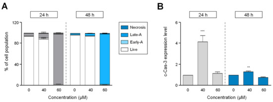 To investigate whether HgCl2 causes apoptosis in H1299 cells, we assessed the induction of cell death by HgCl2 using Annexin-V and PI staining. Numerous studies have reported that mercury causes apoptotic cell death [11,14,16,17]. As shown in Figure 3A, the population of early- and late-apoptotic cells was significantly increased after HgCl2 treatment. Approximately, 95% of H1299 cells were double-positive for Annexin-V and PI showing late-apoptosis, with 60 μM of HgCl2 at 24 and 48 h (Figure 3A). Next, to further demonstrate the mechanisms underlying apoptosis induced by HgCl2, we tested the role of HgCl2 in the caspase-3 activation using flow cytometry. Caspase-3 activity was assessed by immunostaining with cleaved caspase-3 antibody, an active form of caspase-3. Interestingly, HgCl2 treatment did not show a dramatic increase in cleaved caspase-3 expression (Figure 3B and Supplementary Figure S2), despite showing significance in quantitative values (Figure 3B). These results indicated the induction of apoptosis by HgCl2 was independent of the caspase-3 pathway.