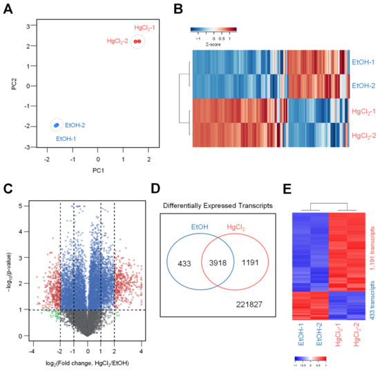 As shown in Figure 4C, the volcano plot was constructed by integrating both the P-value and fold change of each transcript (p-value ≤ 0.01 and absolute log2 [fold change] ≥1) to indicate the general scattering of the transcripts and to filter the differentially expressed transcripts for the HgCl2-treated group (Figure 4C). Application of DEseq2 with a conservative approach to the RNA-seq data obtained from the HgCl2-treated group identified 1624 differentially expressed (DE) transcripts (RNA-seq FPKM values having log2-fold change ≥ 1, adjusted p-value < 0.05, an average of FPKM in each group ≥ 20%). All 1624 DE transcripts (1191 up- and 433 downregulated transcripts) in the HgCl2-treated cells are listed in Supplementary Table S2. The result was verified by the heatmap expression based on the hierarchical clustering of expression ratios for the DE transcripts (Figure 4E).