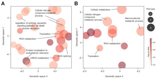The categorization of gene ontology with the differentially expressed genes in the HgCl2-treated group. Gene Ontology terms from GOrilla were further visualized by REVIGO. Gene Ontology enrichment analysis of biological processes for up- (A) and down-regulated genes (B) between HgCl2- vs. 0.6% EtOH-treated group. Circle size reveals proportionally the frequency of the GO term, whereas color indicates the log10 (p-value) for the enrichment derived from the GOrilla analysis.