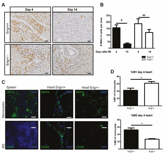 Subsequently we induced MI and assessed the number of macrophages present in the heart using immunohistochemical analysis. Four days post-MI, MAC-3 expressing macrophages were present in large numbers in the border zone of the infarcted hearts of both WT and Eng+/− mice (Figure 1A,B). Macrophage infiltration in WT hearts was cleared 14 days post MI (Figure 1A,B), confirming previous studies that reported that the inflammatory response is most pronounced at day 3–5 and cleared after approximately two weeks [26]. Interestingly, at 14 days post-MI MAC-3 expressing cells were still easily detectable in the infarct border zone of Eng+/− mice (Figure 1B), suggesting a delay in macrophage resolution.