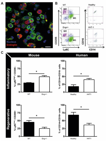 Reparative (M2) macrophages were identified by the expression of CD11b, low levels of Ly6C and high expression of CD206 for mouse, and the expression of both CD14 and CD16 for human cells (Figure 2B). Monocytes isolated from Eng+/− mice as well as HHT1 patients showed an increased percentage of inflammatory macrophages and a reduction of reparative macrophages, compared to macrophages from WT mice and healthy volunteers (Figure 2C).