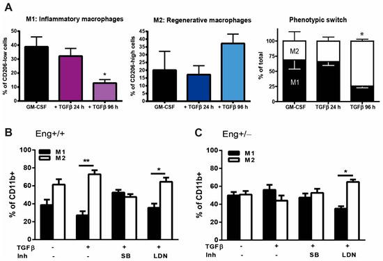 As endoglin is a co-receptor for the TGFβ signaling cascade, we next investigated the effect of stimulation and inhibition of the TGFβ-signaling pathway on macrophage differentiation. Monocytes isolated from bone marrow of WT mice were cultured for 3 days in the presence of GM-CSF to stimulate their differentiation into macrophages, after which 1ng/mL of TGFβ ligand was added for either 24 or 96 h. While 24 h of TGFβ stimulation had little effect on the percentage of M1 and M2 macrophages compared to the non-stimulated cells, 96 h of TGFβ stimulation skewed macrophage differentiation towards an M2 phenotype (Figure 3A).