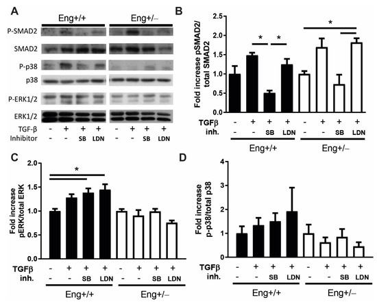 Both WT and Eng+/− macrophages showed an induction of SMAD2 phosphorylation upon stimulation with TGFβ, which was blocked when SB was added, but not when treated with LDN (Figure 4A,B). Phosphorylation of SMAD2 was not different between WT and Eng+/− macrophages. Interestingly, while LDN did not influence TGFβ-induced p-SMAD2 in WT macrophages, a significant increase in the phosphorylation of SMAD2 was observed in the Eng+/− macrophages (Figure 4B).
