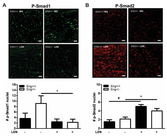 LDN decreases p-Smad1 and induces p-Smad2 in the infarct border zone. Paraffin sections were stained for (A) pSmad1 or (C) pSmad2 and quantified in (B,D) for positive stained nuclei in Eng+/+ and Eng+/− mice treated with LDN or placebo. Representative images of heart sections 14 days post-MI are shown. N = 5–16 mice per group. Eng+/+ control N = 9, Eng+/− control N = 5, Eng+/+ LDN N = 6, Eng+/− LDN N = 16. Scale bars: 30 μm. * p < 0.05; # p < 0.001.