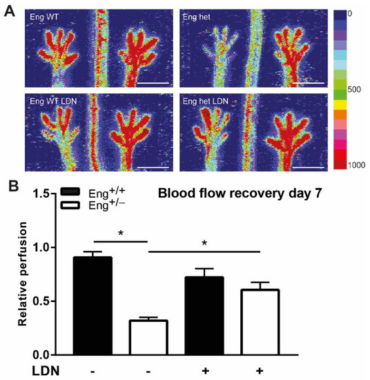 Eng+/− mice show a delayed perfusion recovery after induction of ischemia in the mouse hind limb (Figure 7) [4]. Therefore, to determine whether the effect of LDN was specific for the heart or a more general response of endoglin heterozygosity to an ischemic insult, we chose the hind limb ischemia model in addition to the experimentally induced MI. After ligation of the femoral artery, Eng+/− or WT mice were treated with LDN or vehicle, and perfusion recovery was measured by Laser Doppler Perfusion Imaging (LDPI) at day 7 post ligation. Interestingly, while blood flow in the hind limb of WT mice was not different between LDN or vehicle-treated animal, LDN treatment significantly improved the hampered paw perfusion in Eng+/− mice (Figure 7). Overall, we conclude that tissue repair in Eng+/− mice after ischemic damage in both experimentally induced myocardial and hind limb ischemia was improved by LDN treatment.