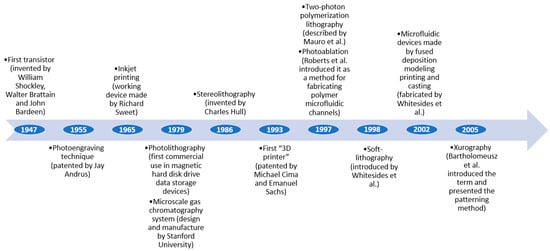 Microfluidics has come a long way in a relatively short time due to several technological advancements from various fields that have gained research interest and been adapted for chip production. Some of the most important breakthroughs that contributed to microfluidics development are comprised in Figure 1.