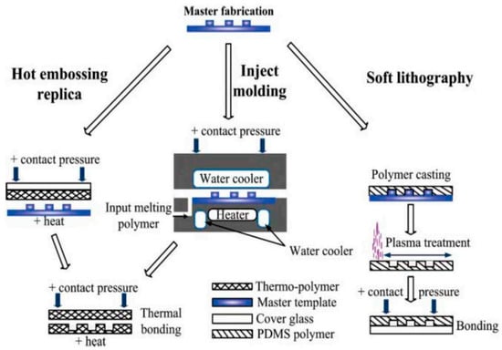 As previously described, there is a wide range of materials from which a microfluidic device can be fabricated. Each of these materials has different properties—hence, a different behavior when being processed. Therefore, fabrication methods must be adapted for the specific characteristics of the involved material and the finite product requirements. Another important aspect when choosing the fabrication technique is the cost. This is essential in microfluidic platforms because they are difficult-to-clean devices and are most often used as disposables. The chosen method must be economically feasible for one-time-only chips [58]. Moreover, for widespread adoption, chips should be manufactured in an accessible and scalable manner [59].
