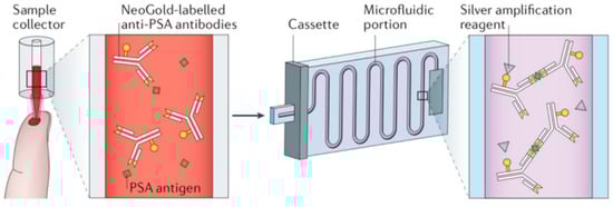 Example of a microfluidic diagnosis device that can detect prostate-specific antigen (PSA) in less than 15 min. Reprinted from an open-access source [82].