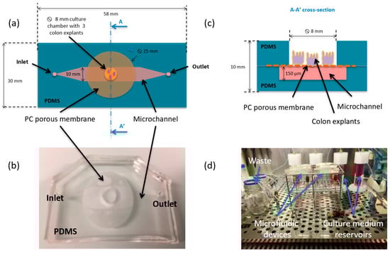 Gut-on-a-chip microfluidic device. (a) Schematic top view of the system made of two polydimethylsiloxane (PDMS) layers and one polycarbonate (PC) membrane; (b) current assembled device; (c) schematic drawing of the A-A’ cross-section; and (d) entire setup (including 4 devices, 9 colon explants, and 4 independent culture medium reservoirs and wastes) placed in an incubator. Reprinted from an open-access source [101].