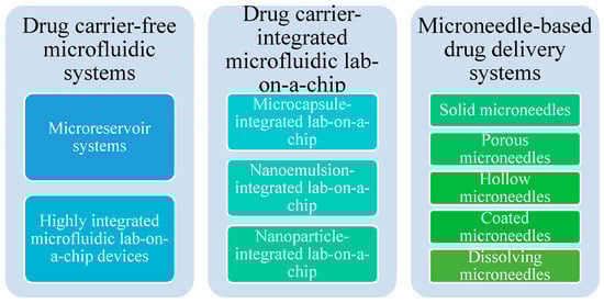 There are three main types of microfluidic delivery systems—namely, drug carrier-free microfluidic systems, drug carrier-integrated microfluidic lab-on-a-chip systems, and microneedle-based drug delivery systems [105]. Each class of devices may have subcategories, as presented in Figure 6.